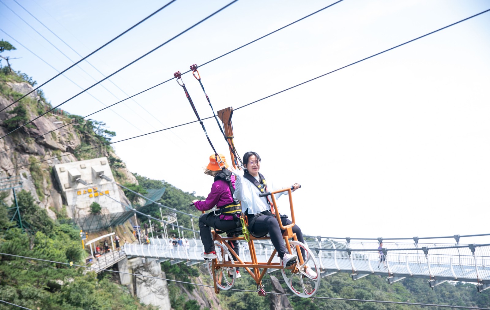 乘坐索道十分钟后抵到达山巅,今日阳光正好,清风徐徐,体感适宜。彩虹滑草的五彩缤纷,绿绿草地的一望无际,仅仅是伫立在此,已是一种享受;登临老鹰巢观景台、鸟巢观景台,是视觉震撼的云海奇观,光影薄雾中的山峰若隐若现,给人一种虚无缥缈之感;队员行走在水晶廊桥、云海栈桥、天空之阶、云中漫道,高空中的轻微晃动就让人尖叫不已,山涧在脚下显得深不可测、缥缈的云雾又给紧张的氛围添上一笔。悬崖秋千是云上草原的王牌项目之一,易彩堂人秉承着易彩堂无畏的精神和勇敢的斗志荡漾在悬崖之巅……