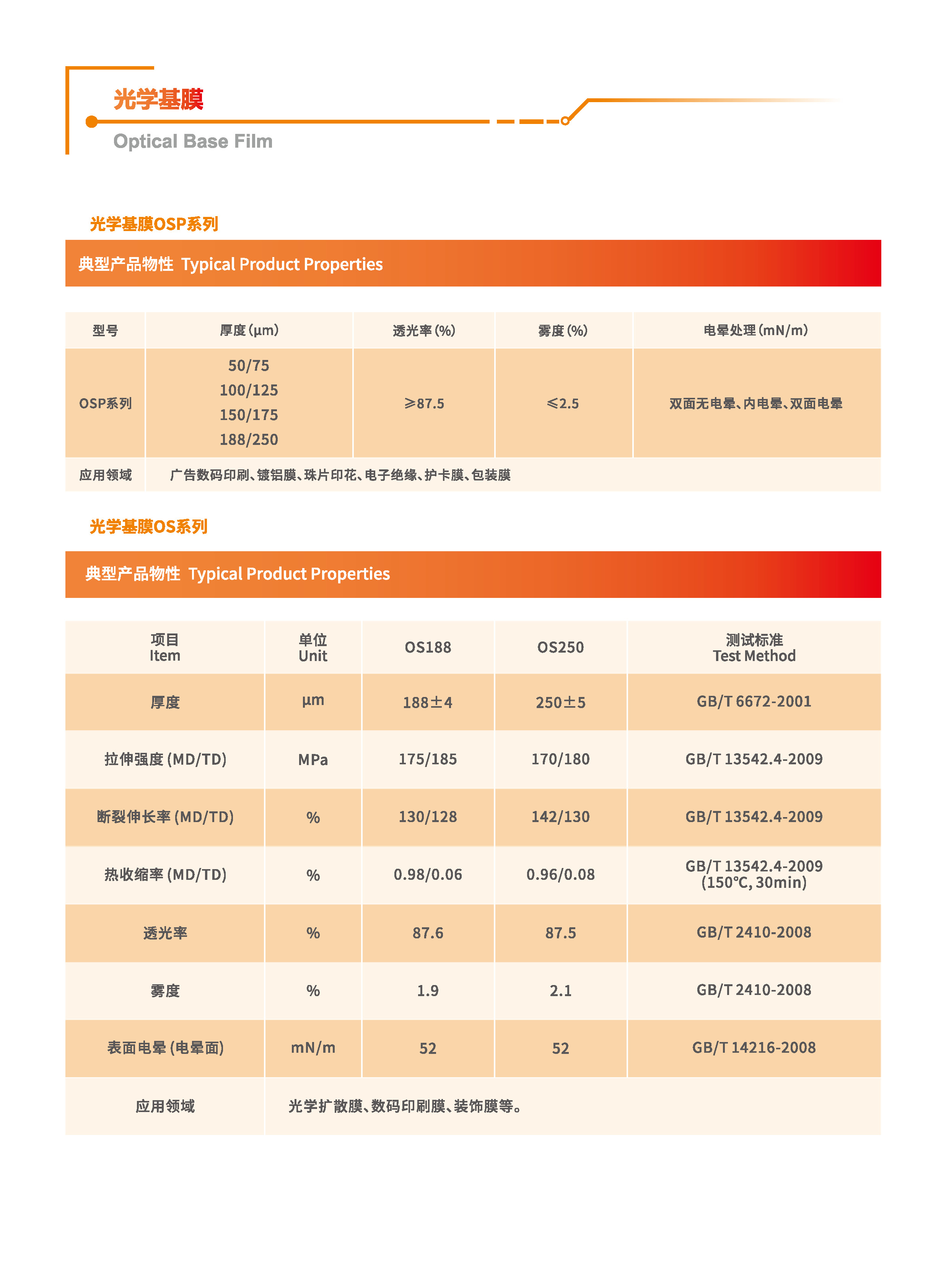 OSP系列:主要应用于广告数码印刷、镀铝膜、珠片印花、电子绝缘、护卡膜、包装膜 OS系列主要应用于光学扩散膜、数码印刷膜、装饰膜等