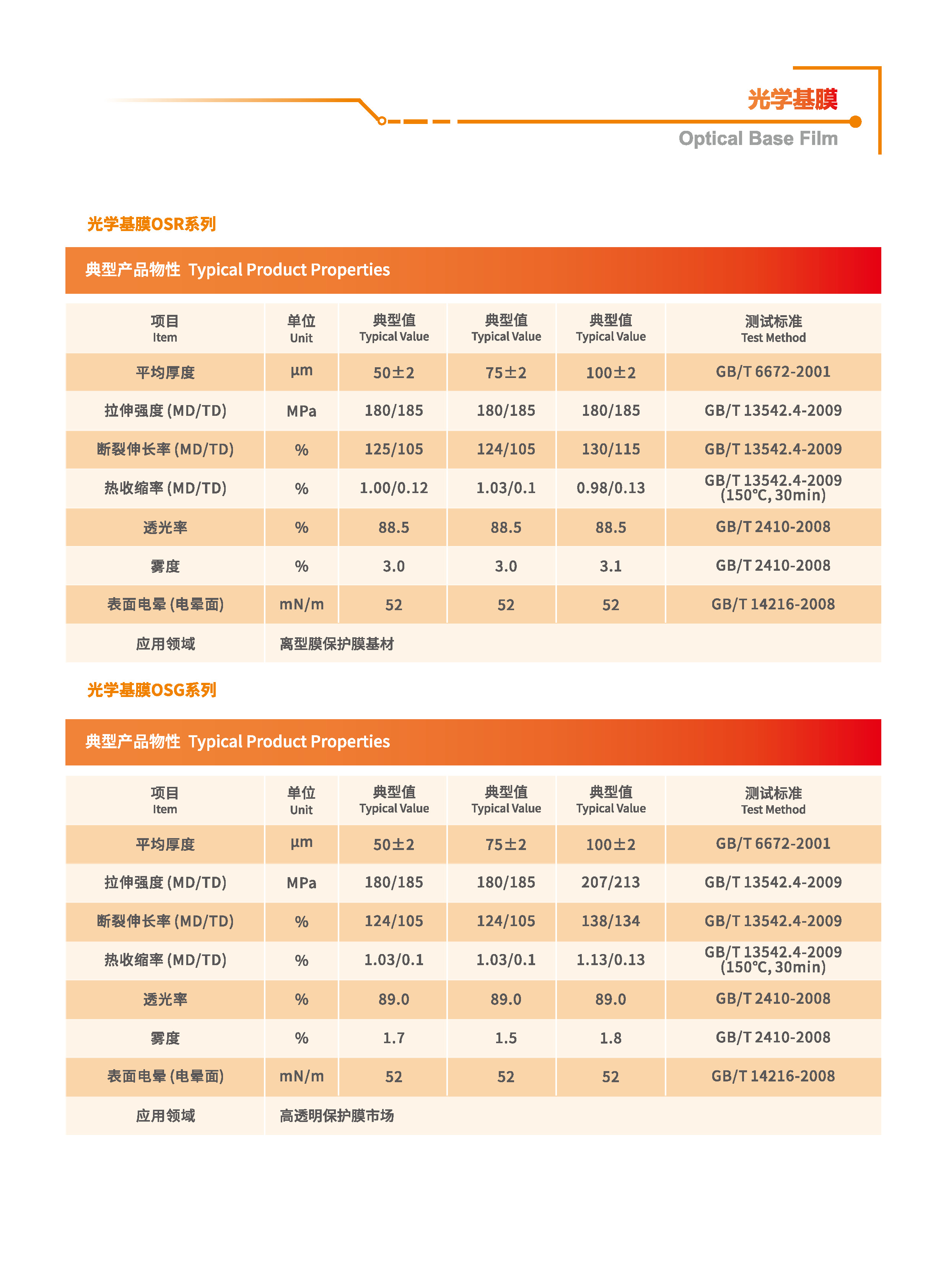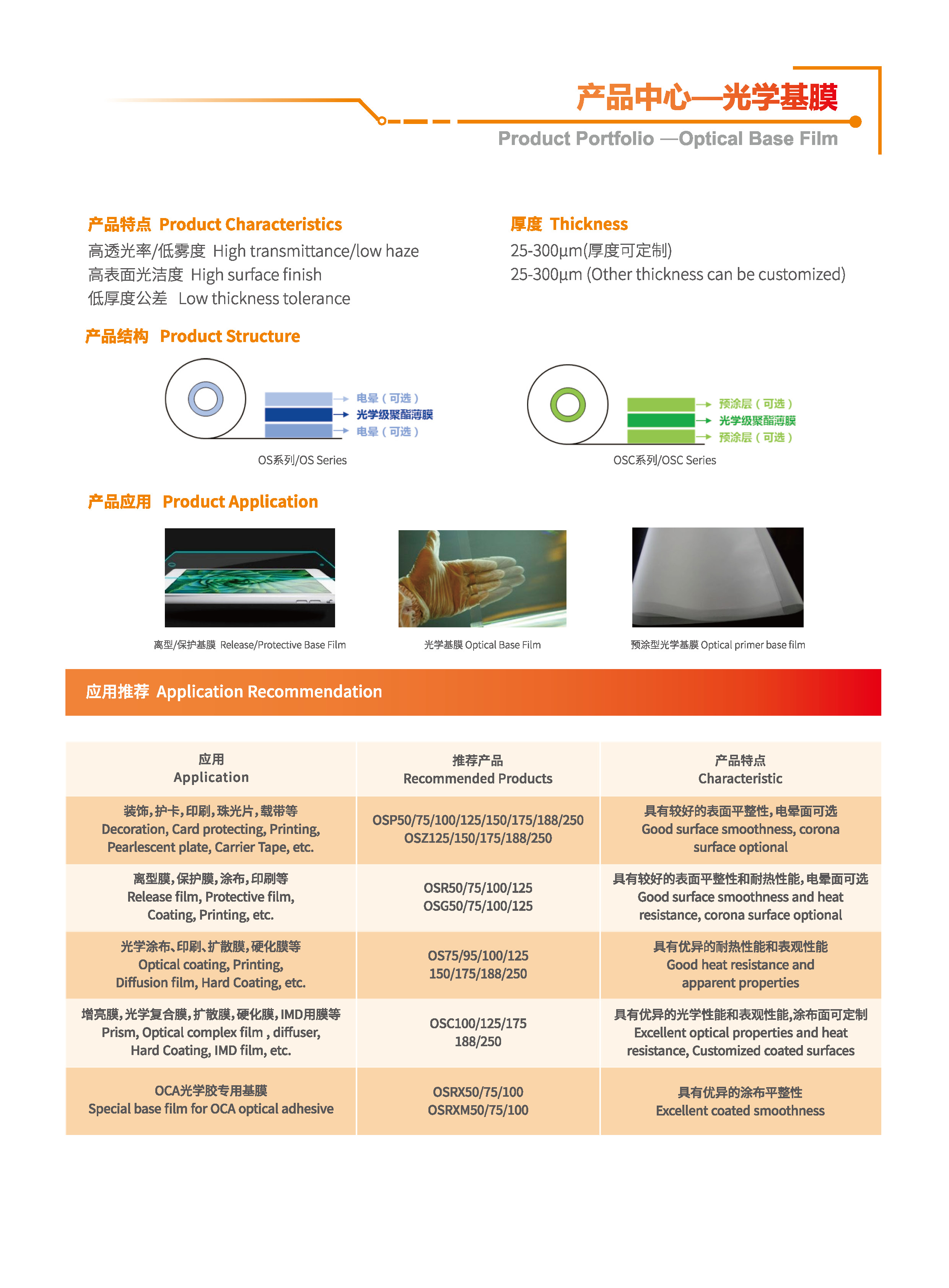 OSC系列:主要应用增亮膜、硬化膜、IMD、视窗保护膜 OSRX/OSRXM系列主要应用于OCA光学胶专用基膜